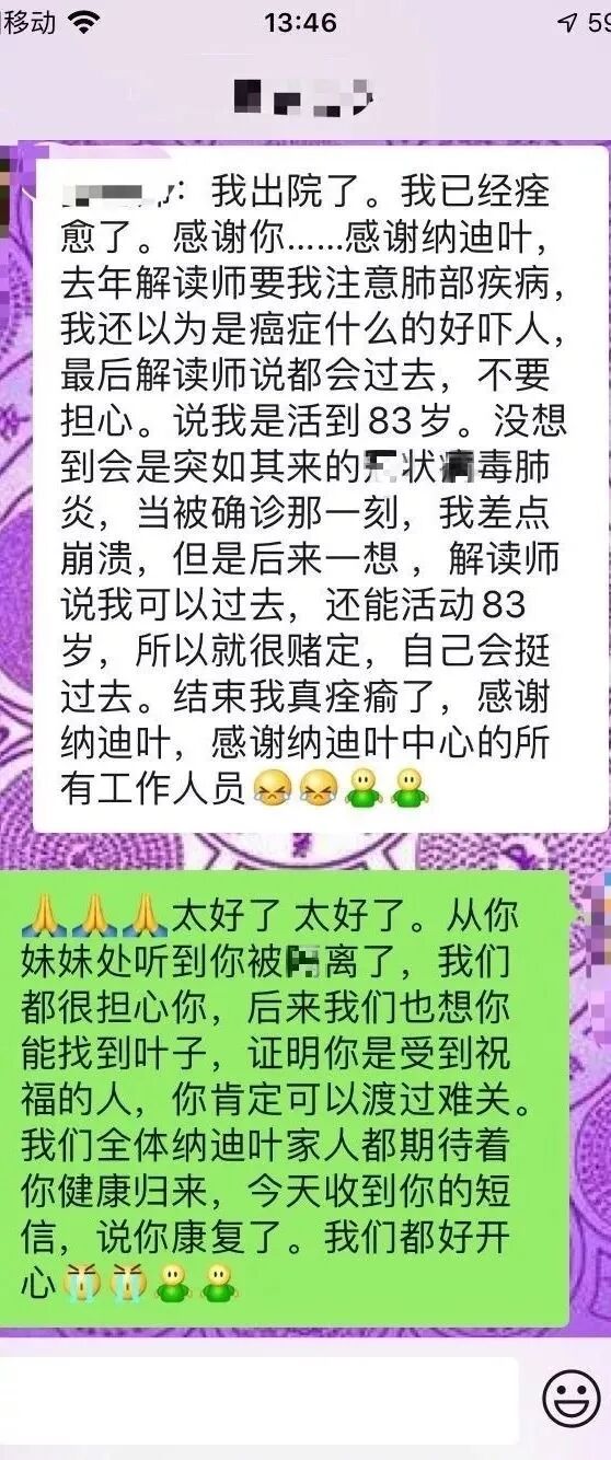 客人从开始得知自己感染“特殊”疾病是很害怕的,但是又想到纳迪叶解读的信息说的自己会康复,而且自己会高龄,反而让自己平静了下来,也让客人不再去考虑太多而影响自己心情,豁然开朗的心情对于疾病康复起到很大的辅助作用,所以客人积极配合治疗。因为自己听从纳迪叶及时就医,让最开始害怕去医院的心理打消掉,从开始的崩溃到自己主动及时就医,让自己在开始轻微没有发展成严重之前就开始了就医和治疗,而且是积极主动,心情也不在有压力,为治疗起到了很好的辅助作用,所以最后客人康复出院!以下是有缘人给的反馈,因为个人隐私,只能以截图方式发给大家参考!今天特意重新编辑这个案例,就是想要告诉所有人,其实我们每个人都是可以提前知晓自己以后路径的,而且还可以通过一些方法改变自己的以后路径,让自己过的更好,只要您相信,就有办法实现!